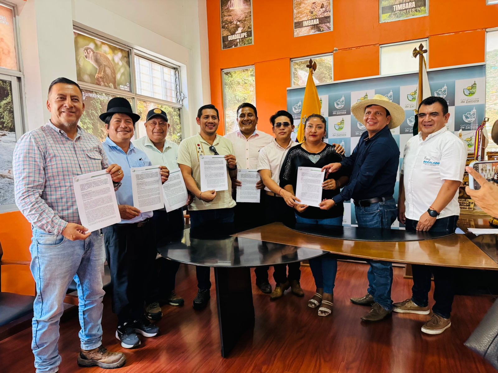 En el despacho de alcaldía, el alcalde del cantón Manuel González firmó un importante convenio con los presidentes de los GAD Parroquiales del cantón Zamora para la ejecución del proyecto “Fomento a las tradiciones y expresiones culturales a través de las artes plásticas, escénica, literarias y musicales en el cantón Zamora”.